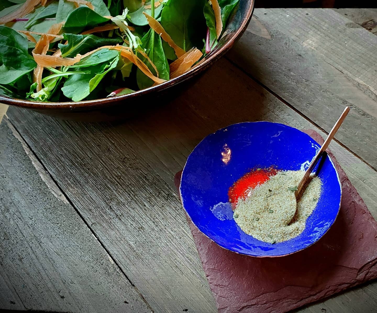 Cobalt Blue enameled copper bowl w/spoon. Approximately 3 1/4" diameter. Food safe. Handwash, not to be put in dishwasher.