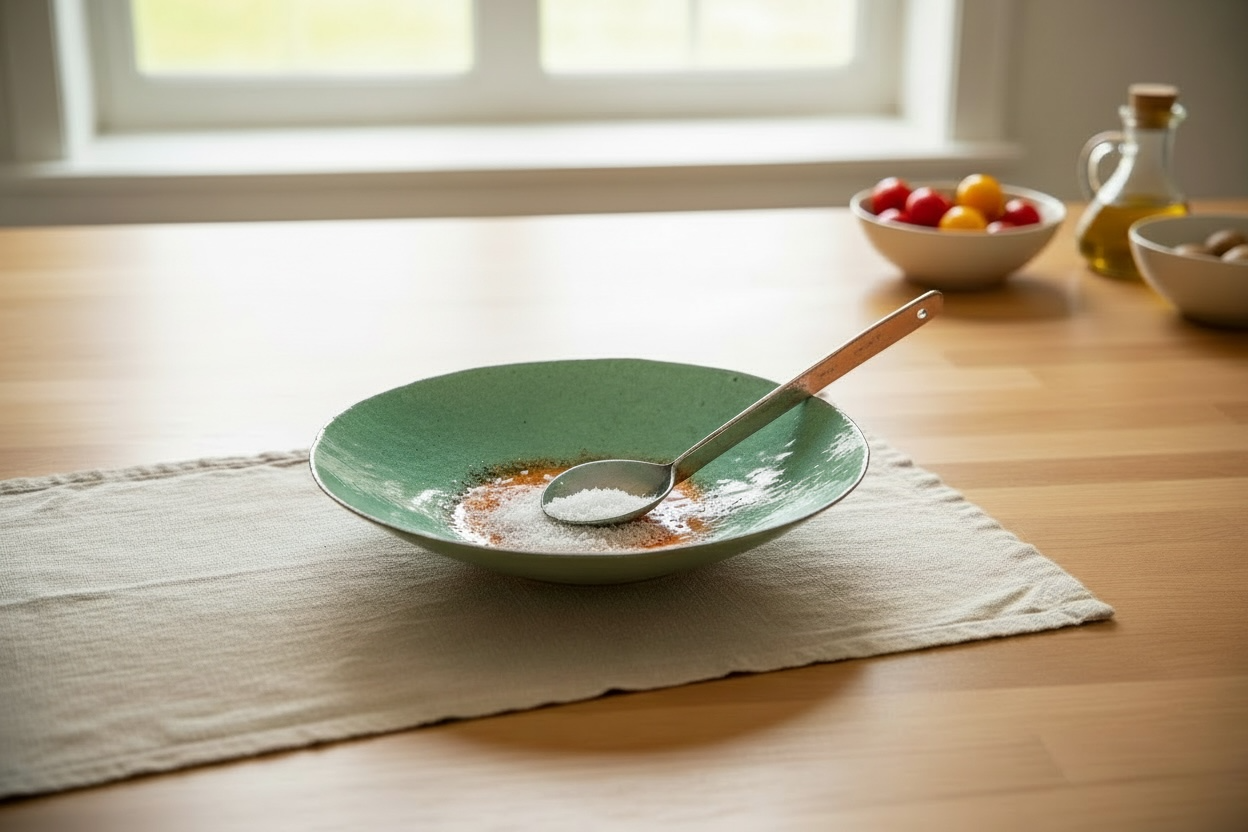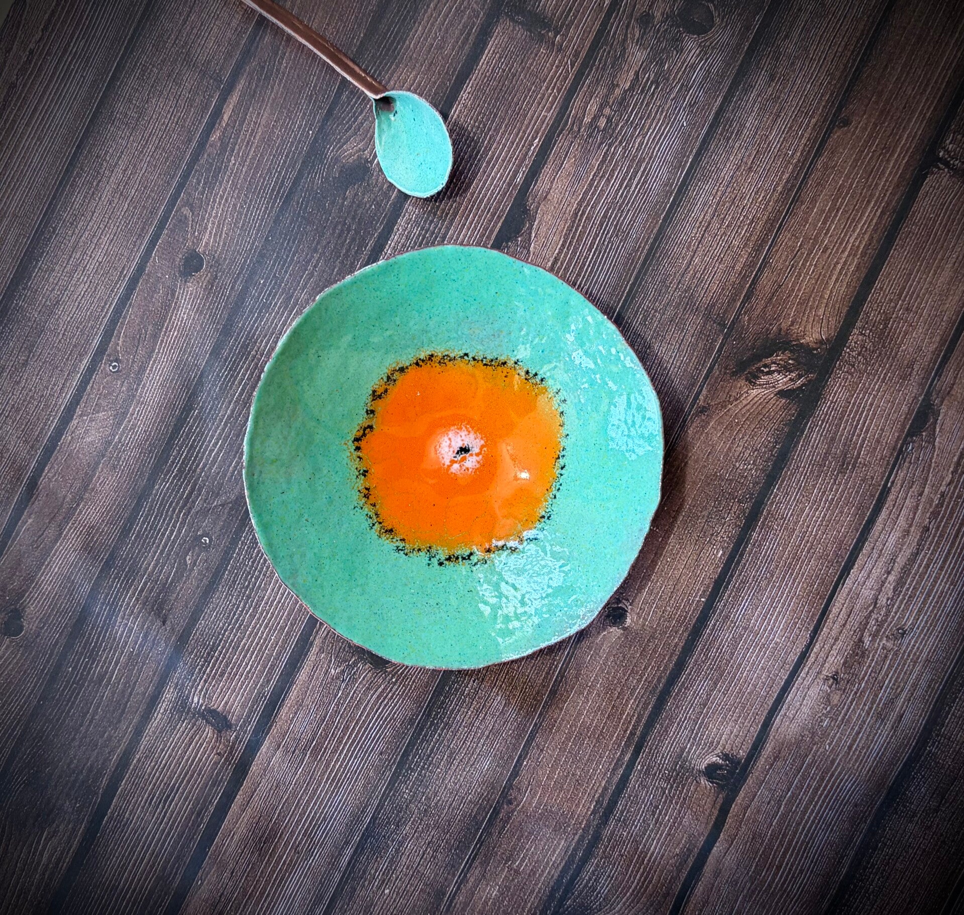 Sea Green with orange enameled copper bowl w/spoon. Approximately 3 1/4" diameter. Food safe. Handwash, not to be put in dishwasher.