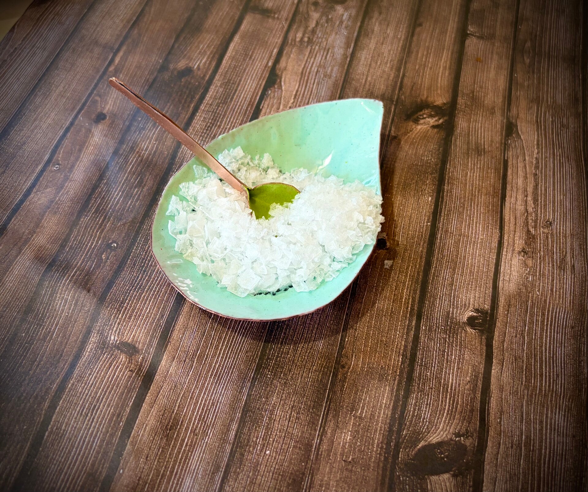 Robins Egg Blue enameled copper bowl w/spoon. Approximately 3 1/4" diameter. Food safe. Handwash, not to be put in dishwasher.