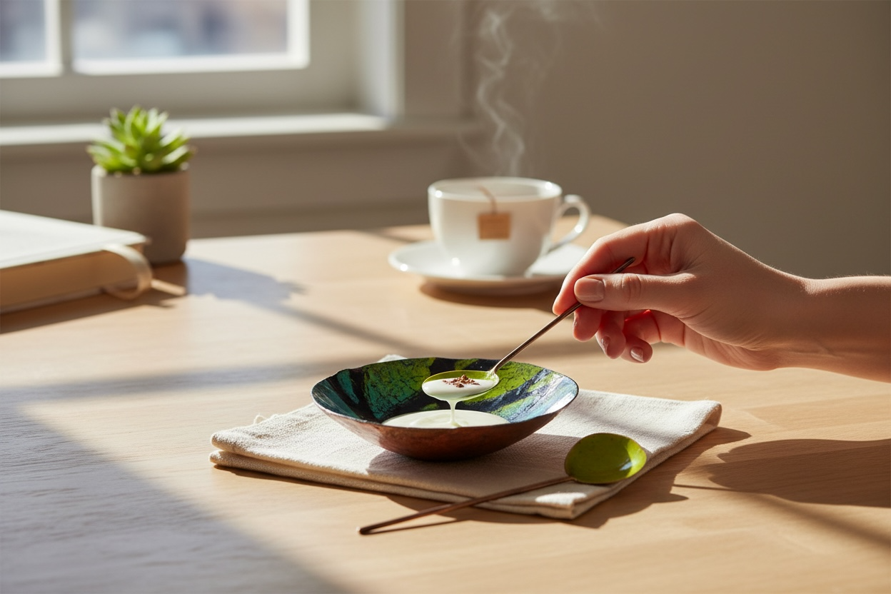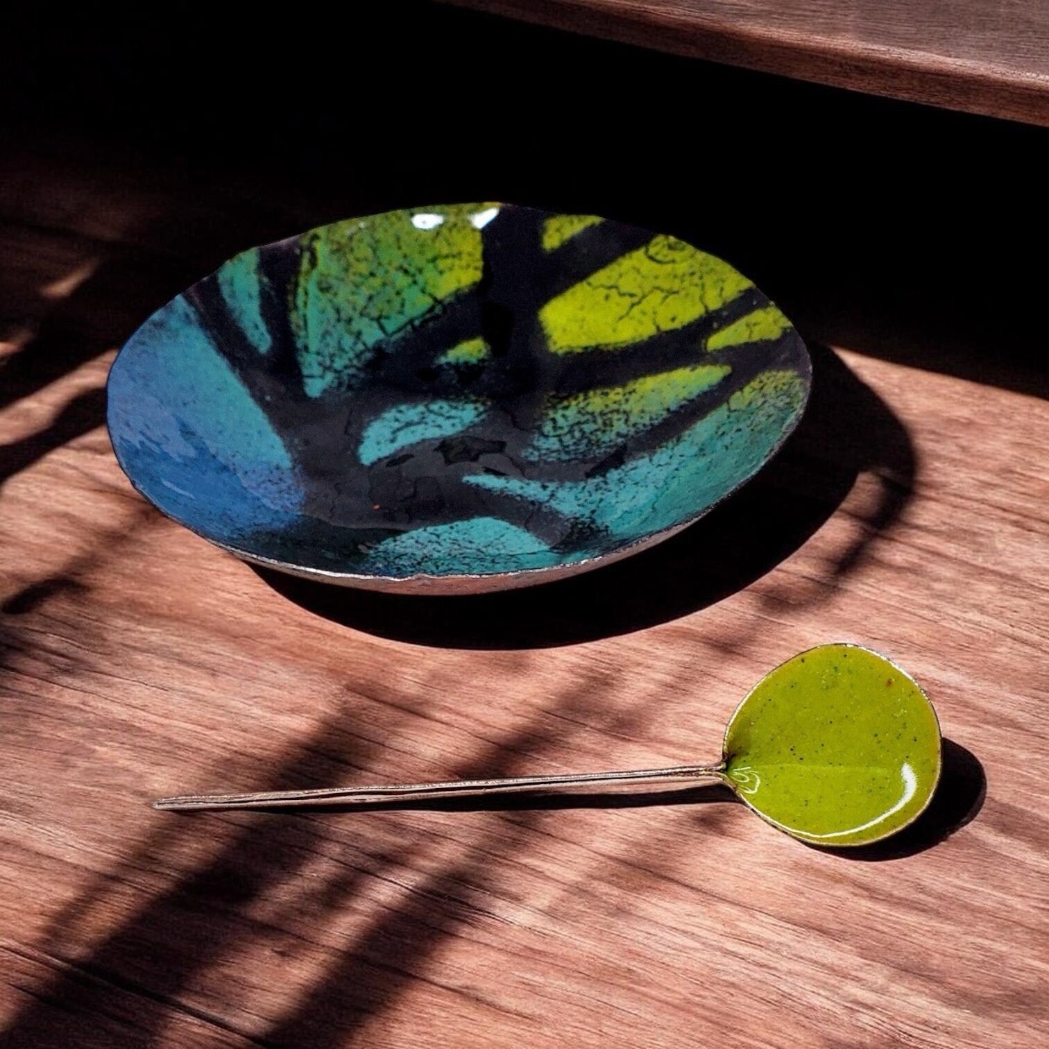 Multi colored enameled copper bowl w/spoon. Approximately 3 1/4" diameter. Food safe. Handwash, not to be put in dishwasher.