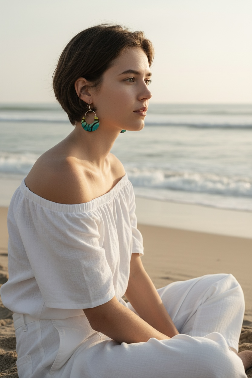 Hand cut and formed enameled copper earrings. Approximately 1 1/2" in diameter. 1 3/4" length sterling silver wire.