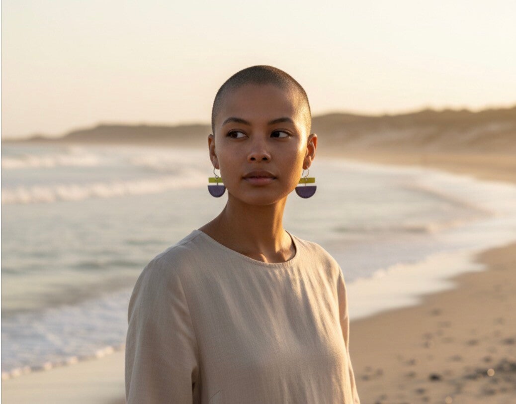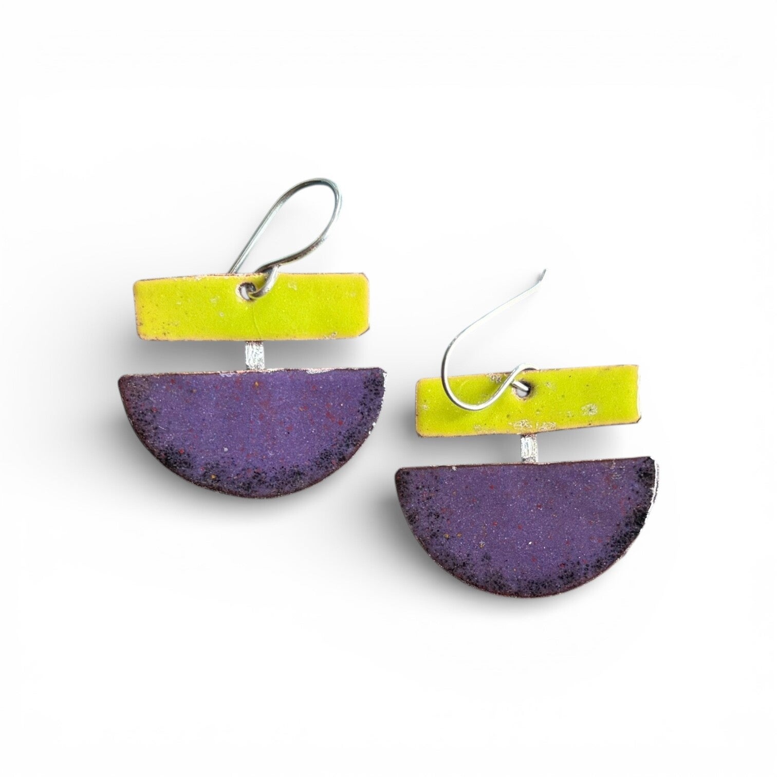 Bitter green and violet enameled copper. Sterling silver wire. Approximately 1 1/2" length 1 1/4" width.