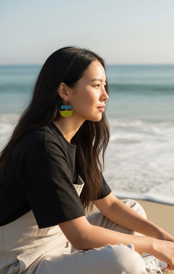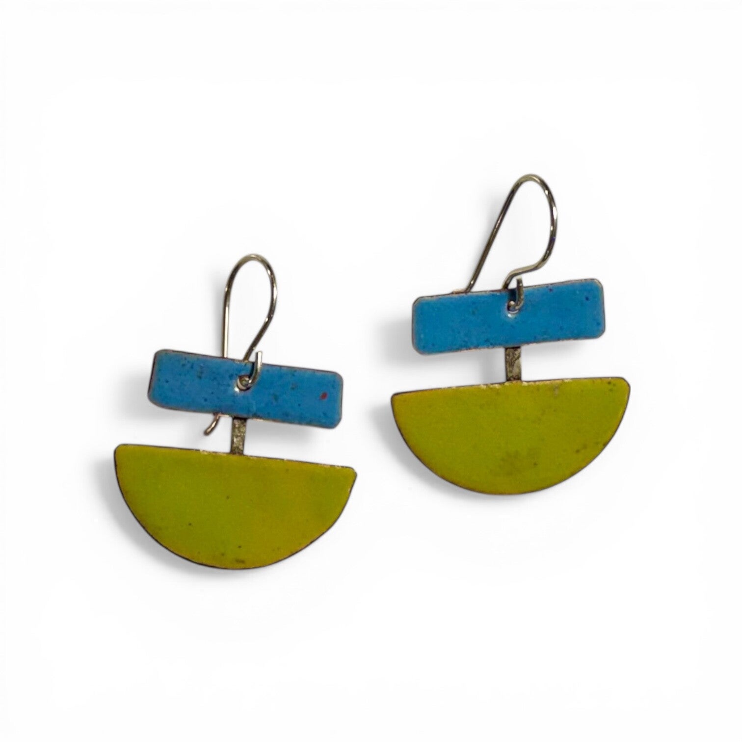 Bitter green and blue enameled copper. Sterling silver wire. Approximately 1 1/2" length 1 1/4" width.